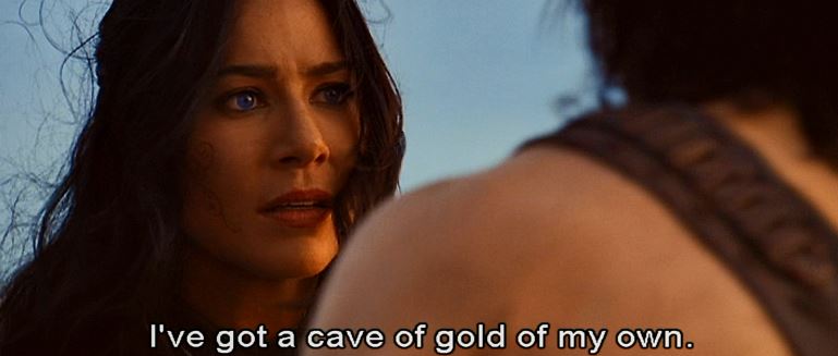 And to make this nightmare even more annoying, he’s captured by some green four-armed, horned creatures known as the Tharks. Their leader, Tars Tarkas, played by Willem Dafoe, is impressed with John Carter’s jumping abilities. The problem is neither side speaks the other’s language resulting in John Carter giving an amazingly written line: