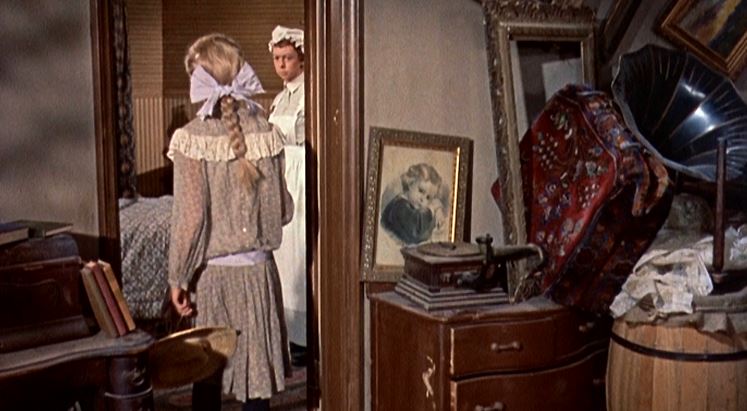 Pollyanna is picked up at the station by Aunt Polly’s maid, Nancy, and gardener played by Nancy Olson and Nolan Leary, respectively.