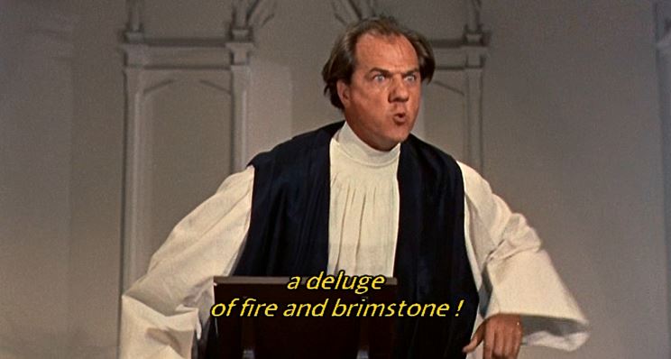 Yep, she makes the Reverend into a “fire-and-brimstone” preacher. You see, her intent behind this is to have the Reverend strike fear into the hearts of the people on Sunday and let it sink through their minds for the rest of the week.