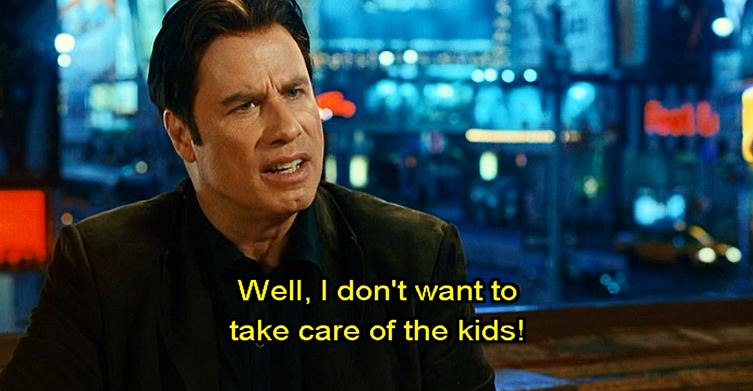 So the day FINALLY arrives when Vicki heads to jail (she tells the kids that she’s going to some spa or the like for two weeks) and the kids stay with Robin. Since Robin lives in an adults-only complex, he persuades John Travolta to allow them all to stay at his house for the two weeks and help him take care of the kids. John Travolta reluctantly agrees.