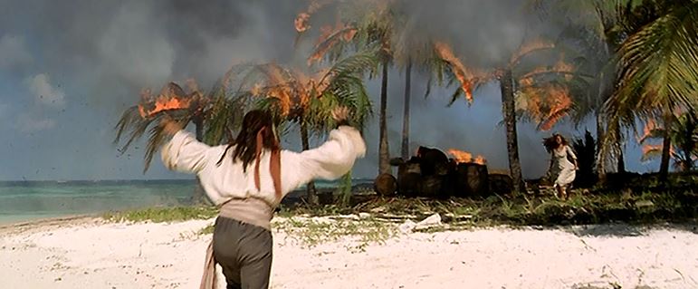 On the island, Jack explains to Elizabeth exactly how he got off the island the first time. Apparently, the island was used as an illegal rum storage by some rumrunners and he bartered passage from them the next time they visited the island. But it appears now that the rum-running business is out of business. So how do they get off the island? Well, Elizabeth decides to set everything on the island on fire so as to attract the attentions of any passing ship.