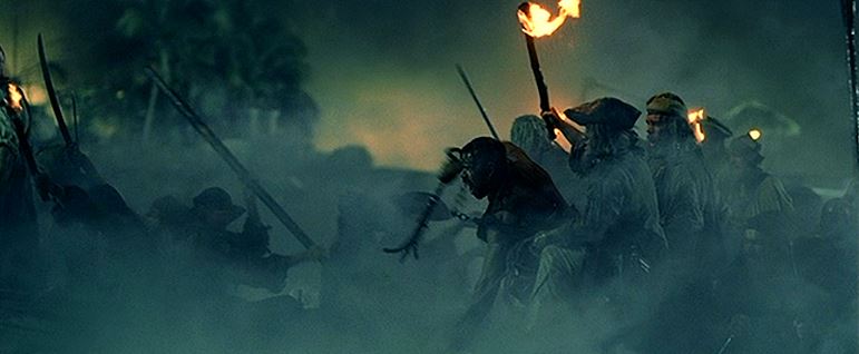 So they head out to the caves in order to lay a surprise attack on Barbossa and his men. Sadly, the surprise is on Norrington as Barbossa’s men attack the “Dauntless”.