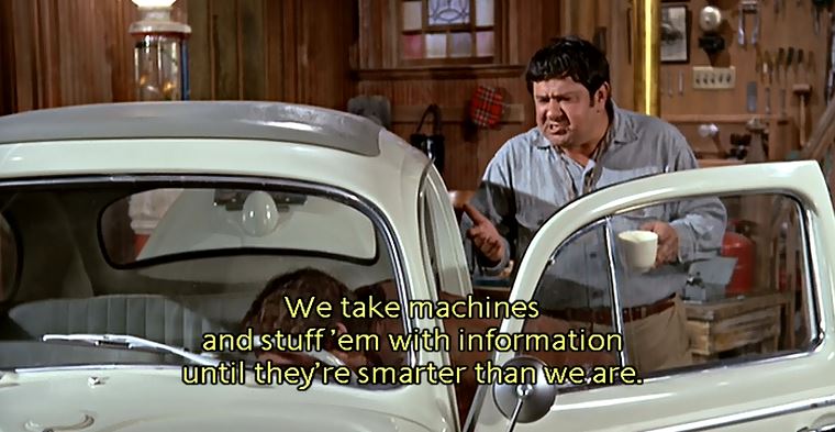 And of course, Jim doesn’t believe him. I don’t blame him. I wouldn’t take philosophy and technology lessons from Buddy Hackett either.