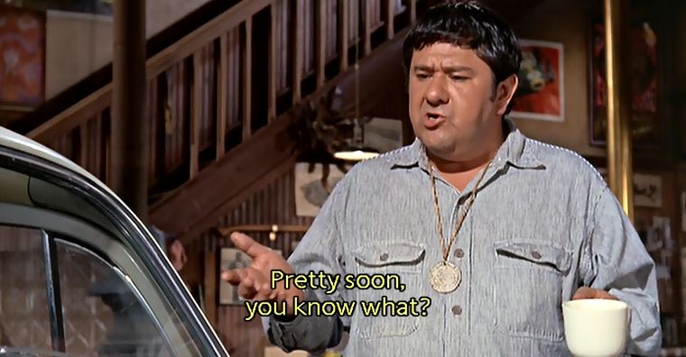 Tennessee tries to convince Jim that maybe racing is not for him and that Jim should try to find another calling. There’s this running joke (well, a running anecdote is a better way of putting it) in the film in which Tennessee often tells of the time that he tried to find his calling by visiting Tibet and hanging out with the swamis and monks there. Wow, Buddy Hackett amongst swamis and monks?! I feel so sorry for those swamis and monks.
