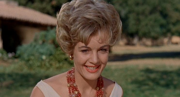 She loves seeing him and loves the big ranch that he owns, but then a stranger shows up at the ranch: a young woman named Vicky, played by Joanna Barnes. Apparently, while his daughter was away at camp, Mitch was enjoying a romance with this young woman and seems to be inclined to marry her. Sharon is shocked at this turn of events, especially after realizing that Vicky’s only marrying her father for his money.