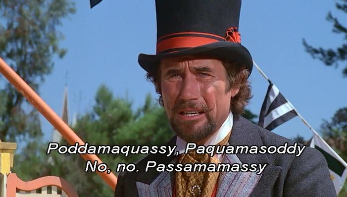 The next day, Passamaquoddy is visited by a quack doctor and his stooge. Doc Terminus, played by Jim Dale, and his stooge, Hoagy, played by Red Buttons, travel from town to town selling phony potions to unsuspecting townspeople. They’ve arrived in Passamaquoddy after being chased out of another town. Doc Terminus recognizes Passamaquoddy as a town that he’s been to before (and been thrown out of before) and he tries to get on the townsfolk’s good side by singing a song about their town. Sadly, he can never get the town’s name correct.