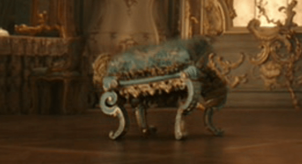 the feather duster maid, Plumette, voiced by Gugu Mbatha-Raw, a harpsichord, Maestro Cadenza, voiced by Stanley Tucci, his wardrobe wife, Madame de Garderobe, voiced by Audra McDonald, and their pet footstool, Frou-Frou.
