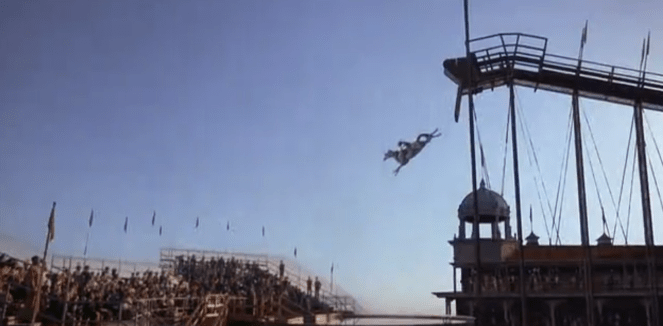 Although having no experience whatsoever, Sonora heads to the county fair, finds Doc Carver, and tells him how she is going to be his next diving girl! Doc Carver, played by Cliff Robertson, tells her that she’s too young for the position. Unwilling to take no for an answer, Sonora keeps trying to persuade Doc to hire her. Eventually, after seeing how good she is with horses (she had horses on her aunt’s country farm), Doc hires her as a stablehand.