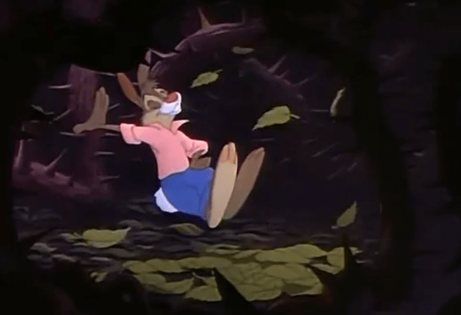 Johnny goes to Uncle Remus and hears another Br’er Rabbit story from him. In this one, Br’er Rabbit gets himself caught up in a tar baby (a figure made out of sticky tar) laid there by Br’er Fox and Br’er Bear. When the two catch Br’er Rabbit, he uses reverse psychology and tricks them into thinking that he’s fine with whatever they wanna do to him (including eat him) just as long as they don’t throw him in the briar patch. Thinking that this will be the end of Br’er Rabbit, Br’er Fox and Br’er Bear throw him in the briar patch, but are shocked when they realize that that was Br’er Rabbit’s home all along!