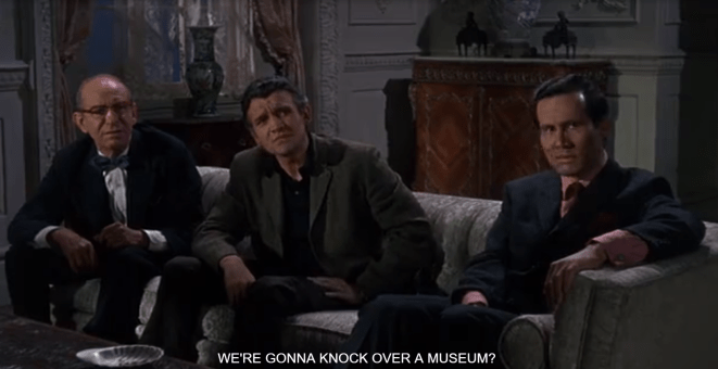 Soon after, Mr. Smooth explains the big job he has planned to Jack and the other heavies. He wants them to steal a famous painting by Dubreaux called Field of Sunflowers from the Manhattan Museum of Art. The painting is 40 feet long and worth $600,000. Mr. Smooth wants his gang to steal it for him so that he can keep it until he dies. Then once he’s dead, he will have the painting donated back to the museum along with money as long as the name of the museum is changed to the Leo Joseph Smooth Memorial Museum.