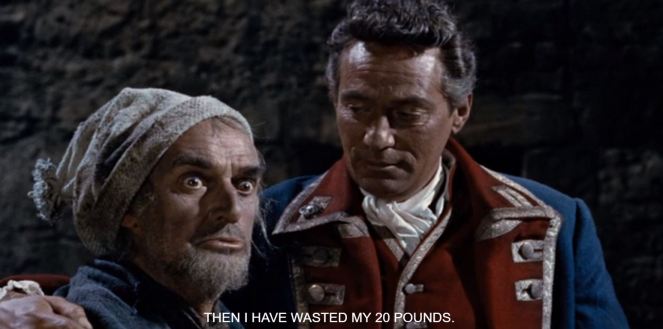 This man happens to be Alan Breck Stewart, played by Peter Finch. Alan Breck Stewart happens to be a Scottish Jacobite who was being given a lift by some of the local fisherman. Now, what is a Jacobite, you may ask. As best as I can make it out, the Jacobites were people who wanted the kingdom of Great Britain (at the time) to go back under the rule of King James II rather than the current king, George.