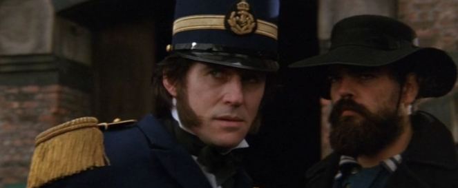 The film begins in a darkened alley where we see a ne’er-do-well named Merrick, played by Gabriel Byrne, shoot dead a member of the British Navy.