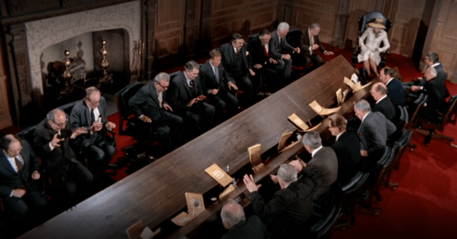 The board comprises many character actors of the time including Larry Gelman and Fritz Feld. They are headed by the company’s president, “Aunt” Harriet Crumply, played by Eve Arden. Dean Higgins eats their cereal mixed with Richard’s formula in front of them and then demonstrates the effects thereafter.
