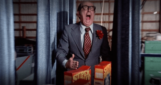 Meanwhile Mr. Krinkle attempts to demonstrate the effects of their cereal with the formula to his board of directors (which also comprises many character actors such as Gordon Jump and Ned Wertimer). This doesn’t go well when he breaks his hand after trying to break the table in half.