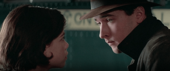 Natty is sad when she reads the letter and misses her dad terribly. To top it off, Sol told Connie to take care of Natty until he can send for her, but Connie and Natty don’t get along at all due to Connie’s strictness and overall apathy towards Natty. Eventually, Natty decides to sneak out of her apartment one night and heads to the railroad track with the intention of hitchhiking the trains until she reaches her father in Washington. She has trouble jumping onto the moving train, but is helped by a “traveling hobo” named Harry, played by John Cusack. Harry doesn’t care to talk much to Natty, but protects her from being teased by other hobos and helps her alight the train when the patrols arrive looking for stowaways. He’s arrested, but Natty is able to escape in time.