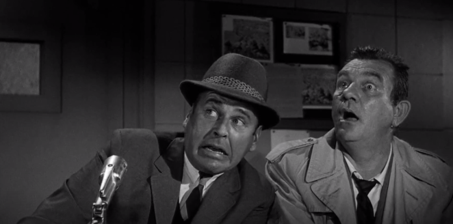 The next day, Professor Brainard receives a visit from shady insurance man, Alonzo Hawk, played again by Keenan Wynn. Mr. Hawk has insured much of the glass in the city and after Professor Brainard’s experiment the other day, he’s forced to pay a lot of money for the damages! However he’s put two and two together and realizes that Professor Brainard’s ray gun is the cause for the glass destruction. He offers Professor Brainard a partnership in a glass insurance scam which the professor turns down. Mr. Hawk isn’t happy with this answer and threatens to take the professor to court to cover his losses.