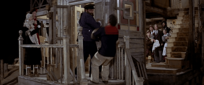 Olive and Popeye have a couple of interactions, but they’re also not particularly welcoming interactions. Popeye tries his best to befriend the townspeople with the person tolerating him the most being a local hamburger lover and moocher, Wimpy, played by Paul Dooley. We learn that Popeye has come in search of his long-lost “Pappy” whom he thinks lives somewhere in Sweethaven.