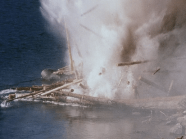 That’s not to say that Charlie doesn’t get into trouble anymore. Nope, one day he accidentally sets fire to the floating kitchen wherein Jess is sleeping unaware that he’s floating downriver in a blazing tent and about to collide with a tangle of logs that is about to be blown up!