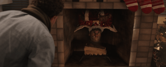 The man is named Nick and is played by Lil Rel Howery. Eddie helps Nick out of the chimney and assumes that he’s come to rob the place. But Nick acts strangely; he seems to think that he really is Santa Claus and came to deliver gifts before getting stuck in the chimney. Eddie, of course, doesn’t believe Nick especially when Nick’s beard is only partially dyed white and when his remote clicker to call his supposed reindeer doesn’t work. He realizes that Nick needs some professional help and says he’ll take him to the police station on the way to dropping off Charlotte.