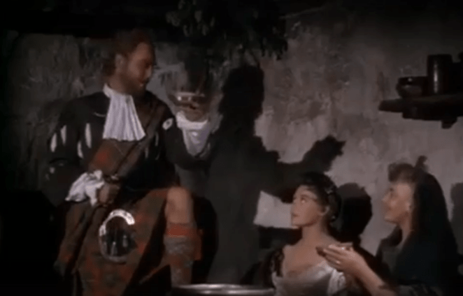 The wedding celebrations are interrupted by the army of the Duke of Montrose, played by Michael Gough. Essentially the MacGregor clan hasn’t been pardoned for their role in the Jacobite rebellion and can no longer use their MacGregor name. Rob Roy is also arrested and separated from Helen and his mother, played by Jean Taylor Smith.